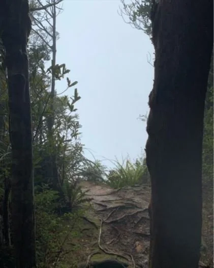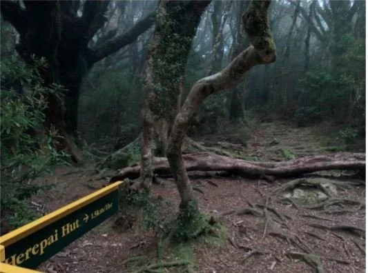 Hitting Herepai hut at 6am and on finding the porch empty of boots, I decided to stop and check the hut out. Unfortunately for the occupants, either somebody had stolen their boots, or they had decided to store them inside, I noisily opened the door to find 5 sleeping trampers. On realising my mistake, I retreated as quietly as possible, filled water from the tank and then carried on through the high grasses and into the misty bush. From here the next planned water stop was Arete Biv, so I loaded up with 3l and headed off.