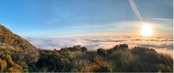 Roel was first up in the morning, just after 4am, and were packed and away and standing at the Park entrance for 5am. The starry night had turned to cloud and although it was starting to brighten with the sunrise it looked thick and could mean clag on the tops. There was no wind and though would mean easier travel, it also meant potentially nothing to blow the clag away.