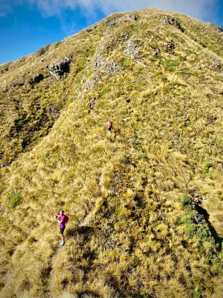 My mood starts to shift. The last couple of K’s to cone saddle turn-off really seems to be dragging on. My feet are beginning to hurt, and although it has been an amazing day, I’m starting to feel “Are we there yet?” vibes. We drop anchor at the turn off, refuel and I mentally prepare myself to go back to the place that took my soul. The Cone of suffering as Martini likes to call it. It’s at this point I wish I could say I set the trail alight as I blazed my way to retribution. But that’s just not reality.