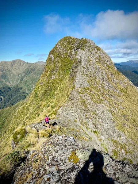 We take a quick food break on top of Adkin. This might be my favourite spot. Looking back at Girdlestone admiring where we have just come from. Behind us the giant that is Mitre with its steep flanks dropping down into a deep valley. You can’t get this view without some serious sweat … or a helicopter.